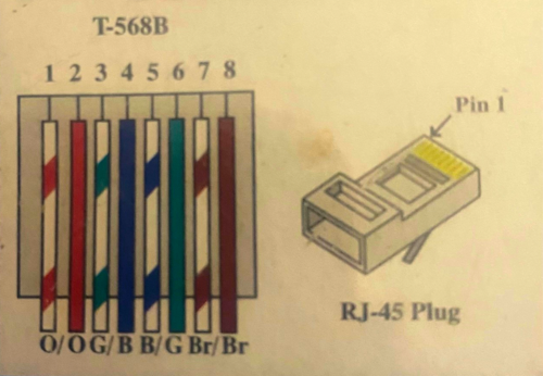 There are standard pinouts for the RJ45 connector and standard wire colours; we are going to use the industry T-568B standard arrangement for a straight-through cable.
