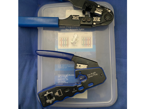 Note that the old style connector crimp tool is dangerous and has exposed cutting blades.
