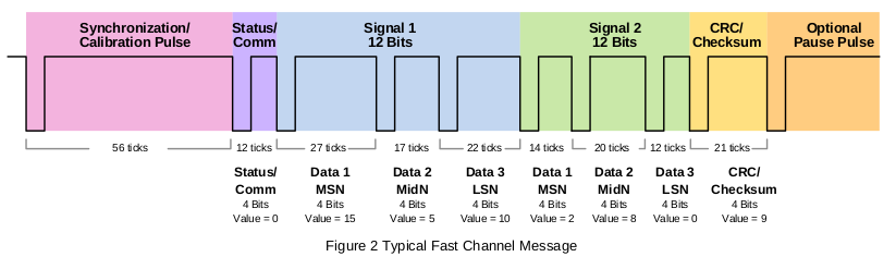 SENT one-wire protocol for sensors using a mark/space transition to synchronize reception of data based on a clock tick that can range between 3uS to 90 uS, and with data transfer based on 4-bit (nibbles) variable length pulse that ascribes the bit value.