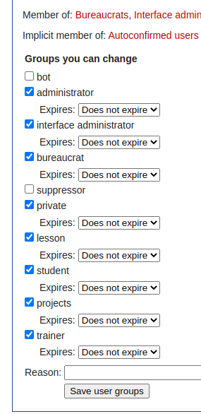 These privileges may be assigned to a selected user from the Special:UserRights page, and are accessible in the php hook via $user->getGroups().